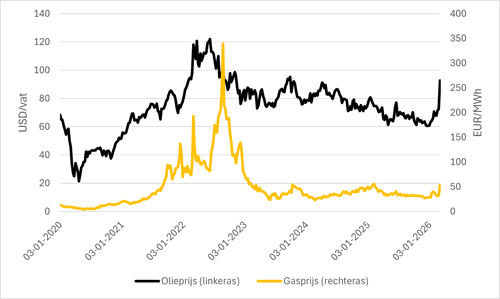 Op zaterdag 28 februari gebeurde wat al een tijdje in de lucht hing, maar toch nog onverwacht kwam: een gezamenlijke aanval van de Verenigde Staten en Israël op Iran. Deze aanval, en de tegenreactie van Iran, drukten in de dagen daarna weliswaar een duidelijk stempel op financiële markten, maar van een paniekstemming is niet echt sprake geweest, in ieder geval tot nu toe. Zoals ook bij eerdere conflicten in het Midden-Oosten waren de gevolgen het meest direct terug te zien op de markten voor olie en gas. De olieprijs steeg in de week na 28 februari met zo’n 30% (maar was sinds begin 2026 ook al met bijna 20% gestegen) en de gasprijs met bijna 70%. De koersen op de meeste aandelenbeurzen daalden, maar de koersdalingen bleven in vergelijking met eerdere ‘crisis-momenten’ redelijk beperkt, tot 5-10%.